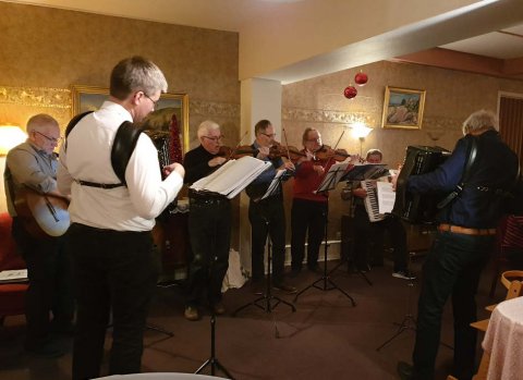 D. 8. december, 2021, deltog Folk og Fæ i Hasle Kirke's 16:58 koncert. Her ses Folk og Fæ som spiller efter aftensmad i restauranten Herold, hvor alle der deltog i koncerten fik en gratis måltid som tak.