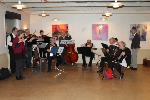 ![]() 10 spillemænd fra Folk og Fæ. Lars Peter Schultz (ikke med på billedet) spillede [...]for til de sværeste numre. Læs mere...↑ | ![]() Balkort! Det var absolut med til at sætte humøret op. | ![]() Nogle medlemmer nød dansen og musikken. |