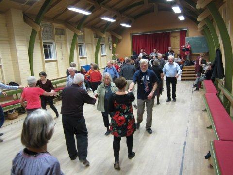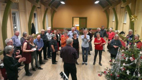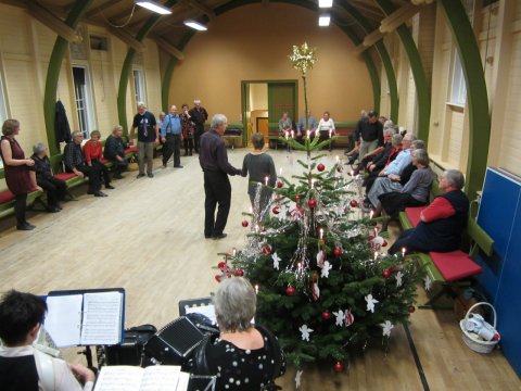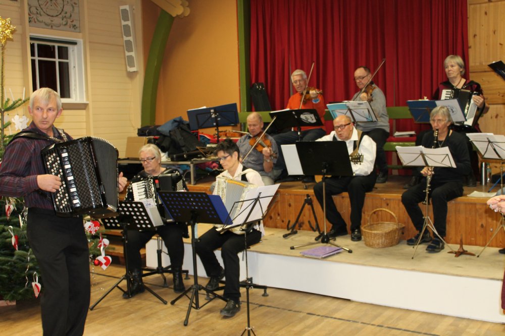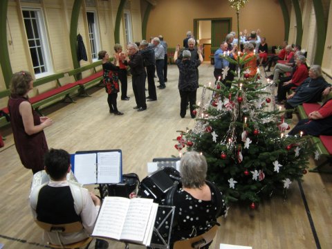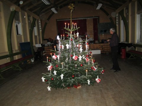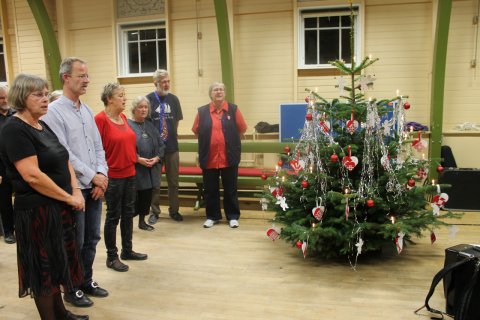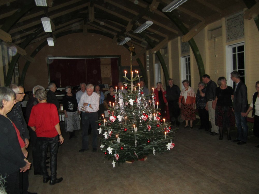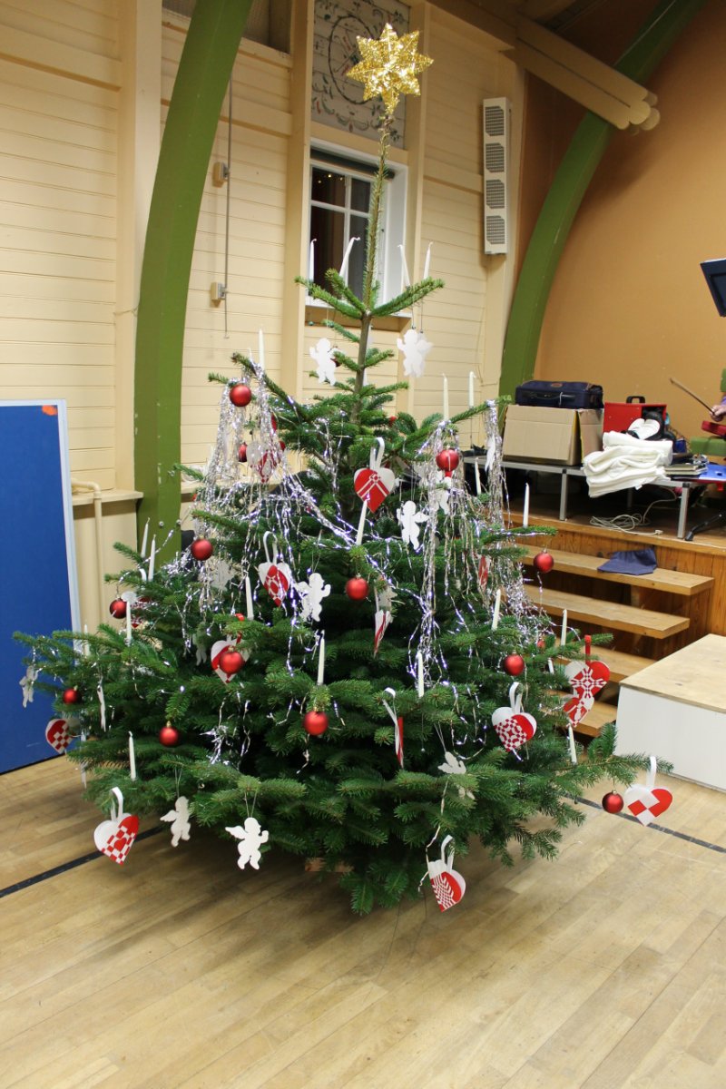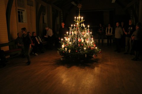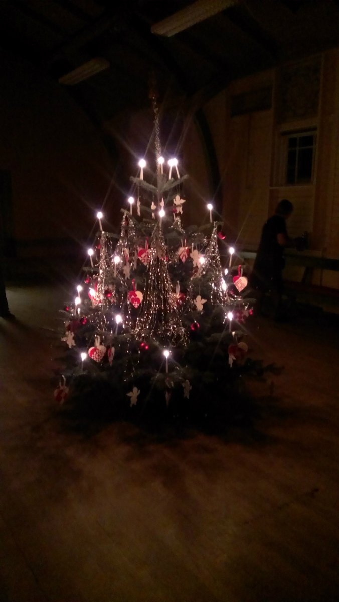 En dejlig aften på højskolen med dejlig stemning med dans, æbleskiver og punch samt hygge og sang omkring træet.