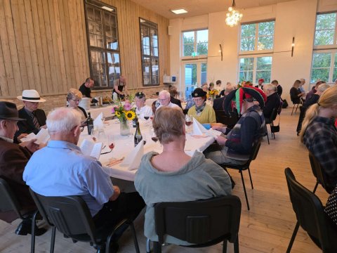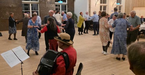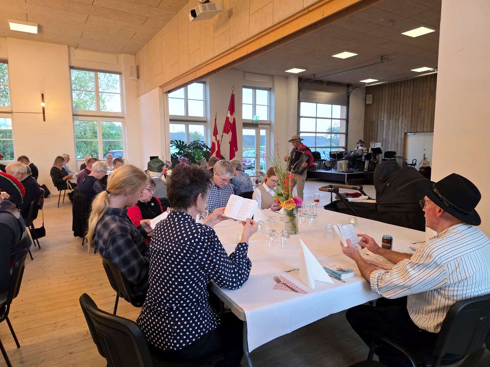 ![]() Før maden var der fællessang. | ![]() Fællessang. Ovre i det mørke hjørne sidder én ensom musiker der [...]spiller med Niels Anker. Læs mere...↑ | ![]() 70 år og der danses endnu. |