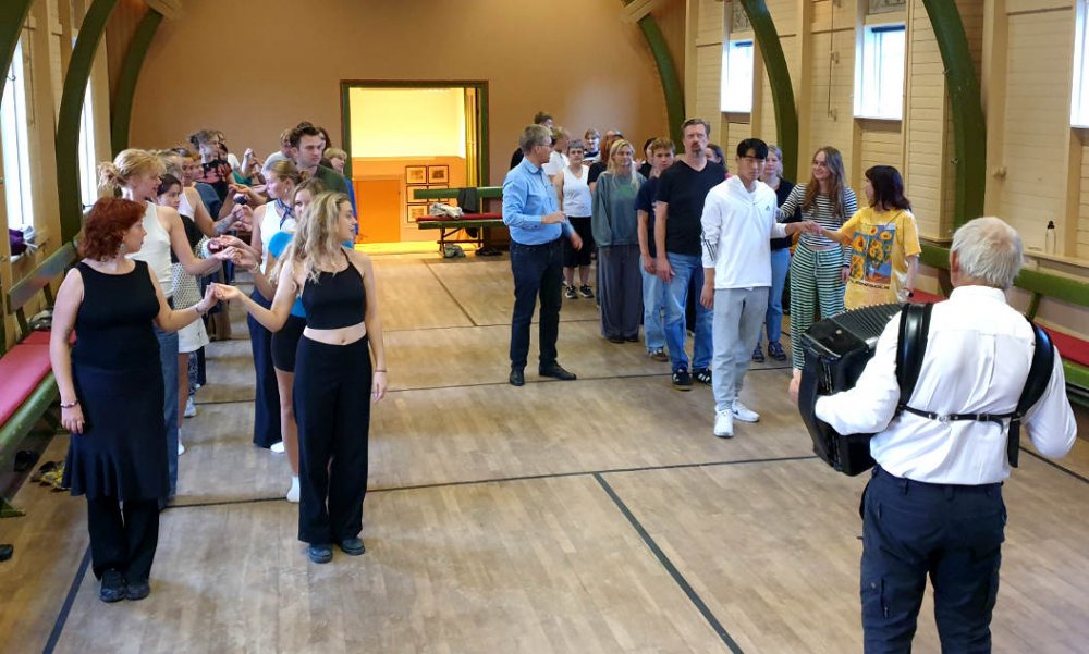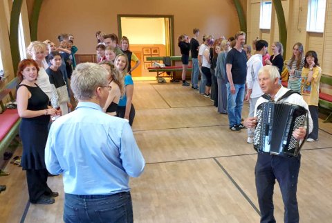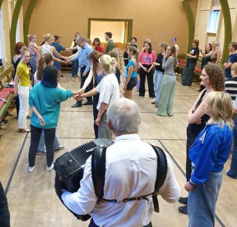 D. 30. august, 2023 prøvede et hold på Bornholms Højskole folkedans. Asbjørn instruerede og Folk og Fæ spillede.