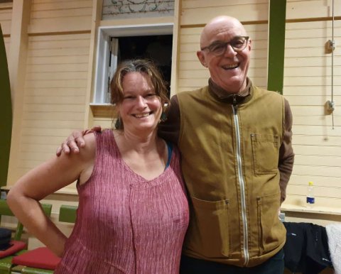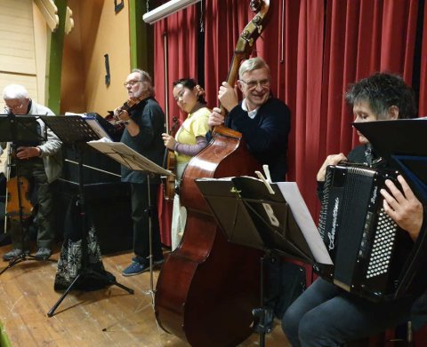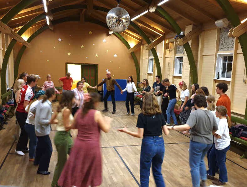 ![]() Forstander, Solveig, og mand. | ![]() Folk og Fæ fik en gæst på violin. (Tredje fra venstre.) Hun var [...]med til at spille nogle numre, så gik hun ud på dansegulvet resten af aftenen. Læs mere...↑ | ![]() Højskolens elever er i gang med at lære en dans. Alma instruerer. | |||