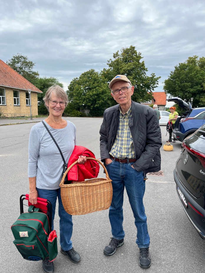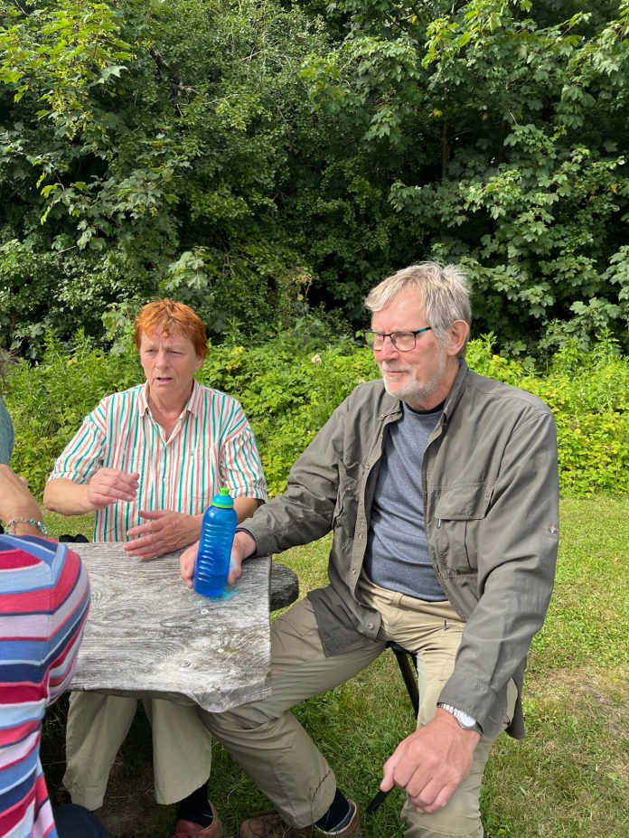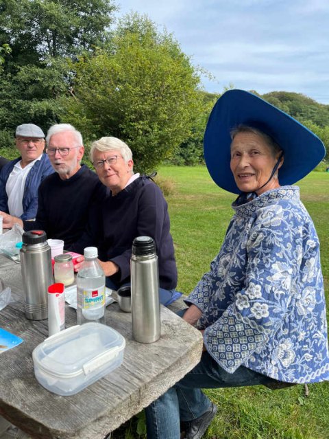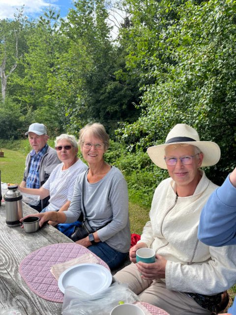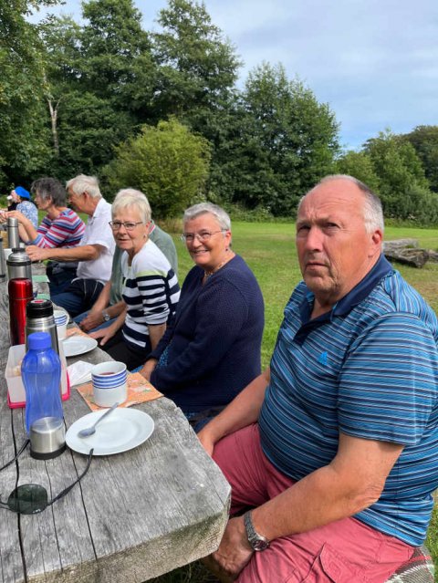 20 folkedansere nyder kaffen efter vandretur i det grønne.