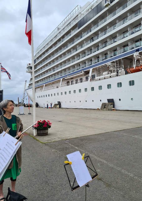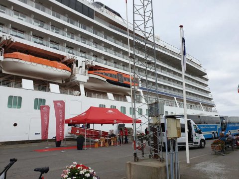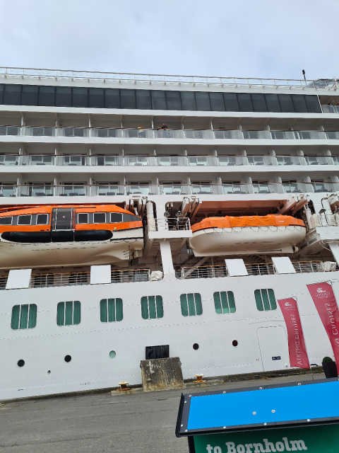 ![]() Krydstogtskibet her anløb formiddagen 17. juli, 2022. Mens passagererne gik fra borde, spillede en gruppe [...]fra Folk og Fæ. Normalt er det Fritz Madsen der underholder. Vi er hans ferieafløsere. Læs mere...↑ | ![]() Siden af skibet. | ![]() Resten af skibet. |