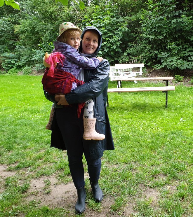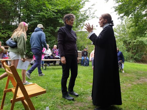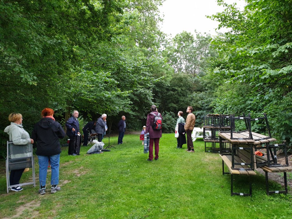 Folk er lige ankommet og diskuterer om vejret ville holder. Det regner lidt imens. [...]Der er ikke nogen Plan B, regnen stopper, så opstillingen af bænker og kors begynder.