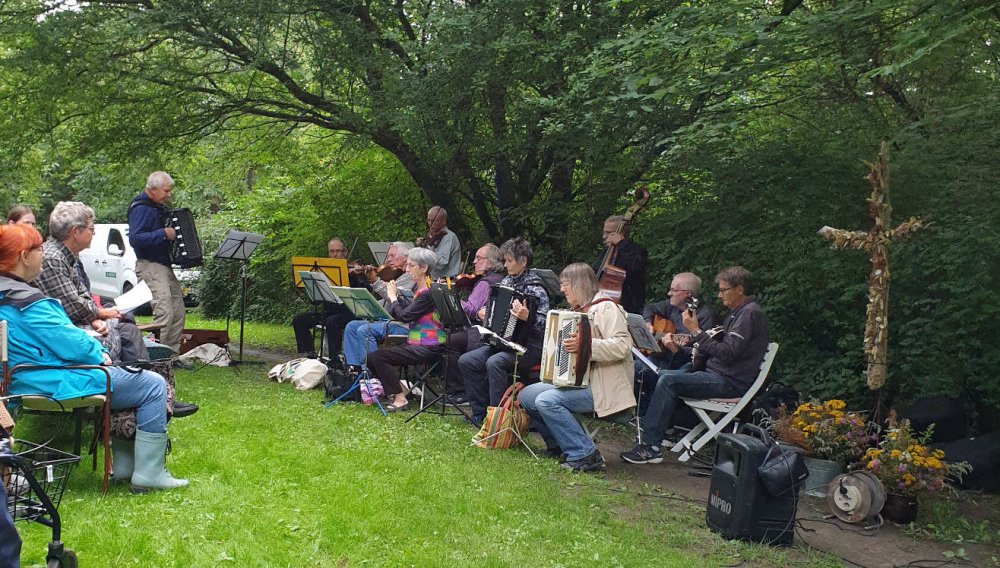Gudstjenesten var forbi, det havde ikke regnet endnu, Folk og Fæ havde deres instruementer i hænderne stadigvæk og var ikke meget for at stoppe med at spille.
