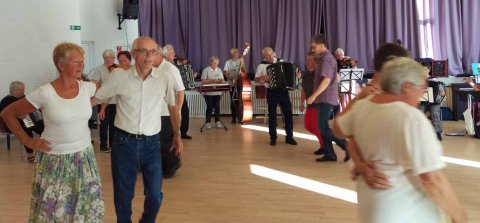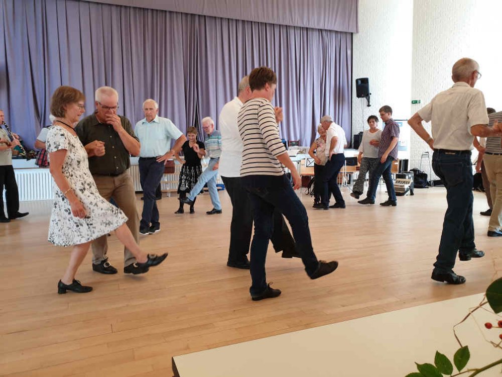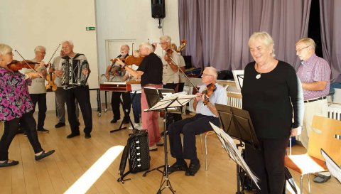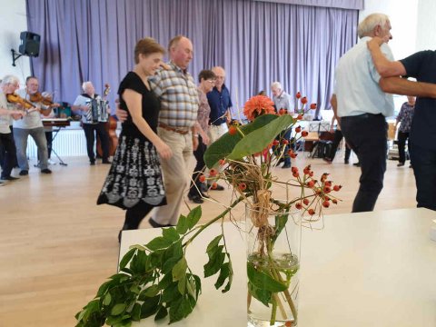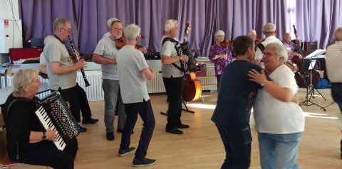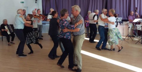 Folk fra gruppen, Gladpack Spelmän, spiller op til dans. De er fra Sverige [...]og var på besøg på Bornholm.