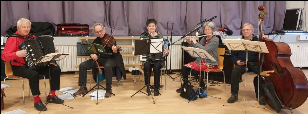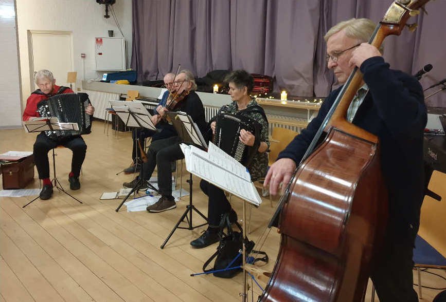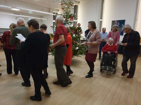 ![]() Orkestret i gang. Nu er John med. | ![]() Der synges mens man går rundt om juletræet. |