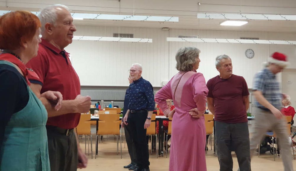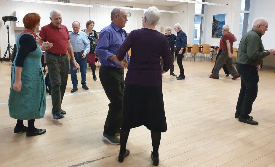 ![]() Først var der en velkomsttale fra Asbjørn, og så en fælles [...]sang og så begyndt dansen. Læs mere...↑ | ![]() | ![]() Nogle af danserne som lytter til Nisse Asbjørns instruktioner/demonstrationer. |