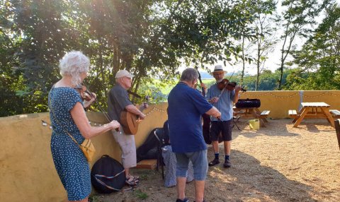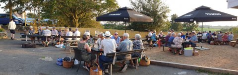 ![]() Buskspil ved buskene. Bemærk at nogle spillemænd er allestedsnærværende. (Henrik [...]spiller oppe på terrassen også, og Lars Peter spiller med den anden busk gruppe.) Læs mere...↑ | ![]() Aftensmadtid. De fleste valgte at spise udenfor. | ![]() Laugets orkester (noget af det.) |