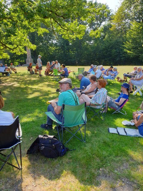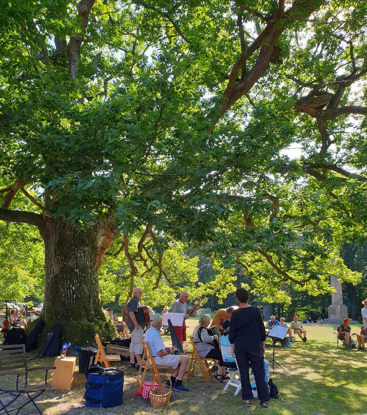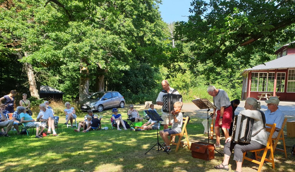 ![]() Musikerne gør klar under egetræet. | ![]() Niels Anker spiller sammen med barnebarn, Aslak. | ![]() Nogle af deltagerne. |