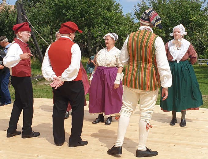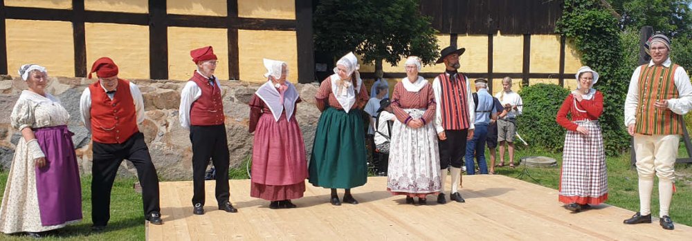 ![]() Asbjørn fortæller lidt om dragterne. De seks dansere på venstre side har [...]bornholmske dragter på. De sidste tre har fynske dragter på. Læs mere...↑ | ![]() Danserne står opstillet klar til dans. | ![]() Spillemændene. |