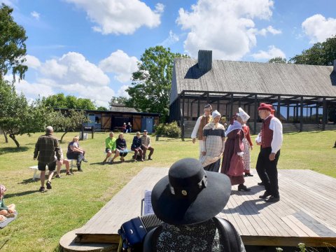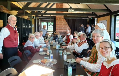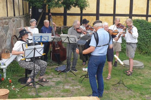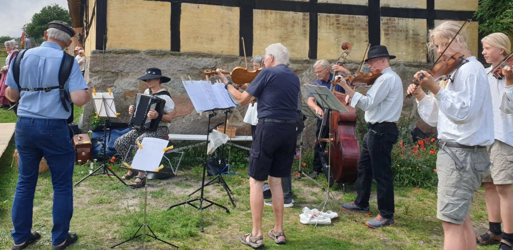 Opvisninger på Melstedgård i 2024 er blevet skudt i gang. Vejret var solrigt men meget blæsende som det tit er på Melstedgård. Scenen var blevet sat på den store græsplæne foran Madkulturhuset, hvor vi fik kaffe og kage bagefter. Musikerne gemte sig lidt rundt om hjørnet i læ af en bygning, så nodestativerne ikke blev blæst over for tit.