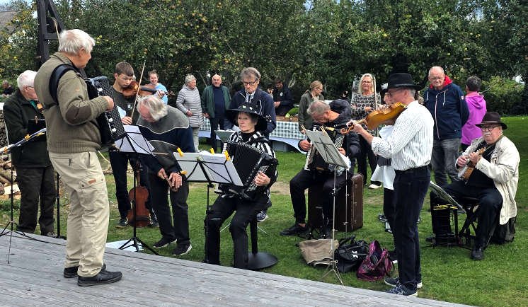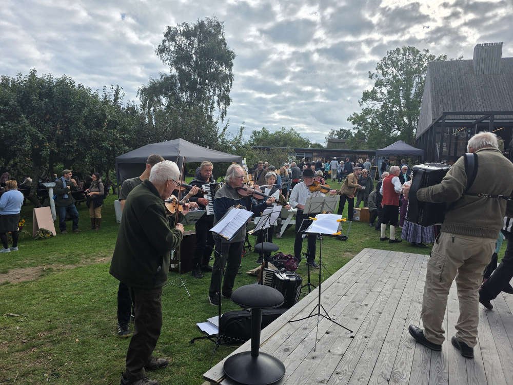 I forgrunden står og sidder musikerne og i baggrunden kan man fornemme hvor [...]mange folk der var på Melstedgård i dag.