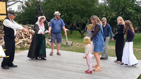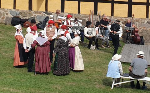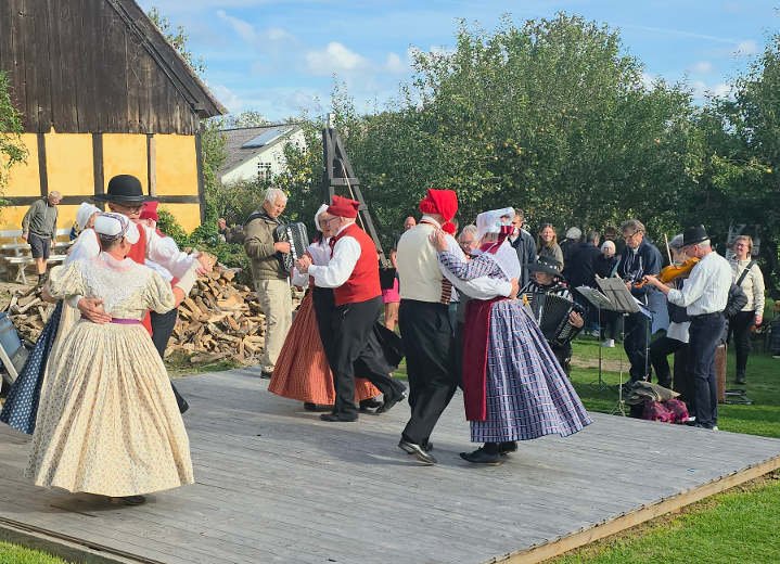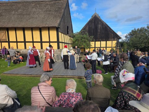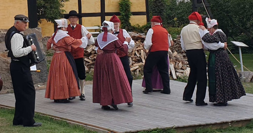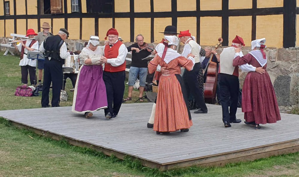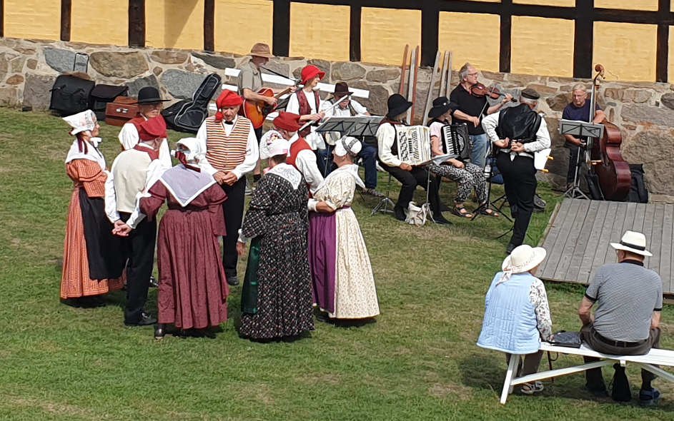 Så er Melstedgårdsæsonen skudt i gang for Bornholms Folkedansere og Folk og Fæ. Det var godt vejr for det. Der var ikke så mange gæster på museet i dag, men de dannede et lille publikum for os, og der var flere hist og pist på afstand som lyttede og kiggede.