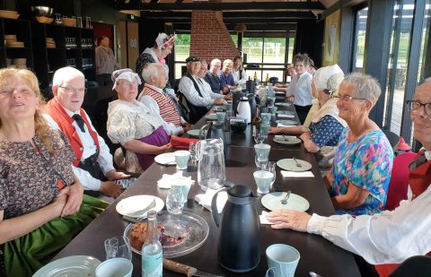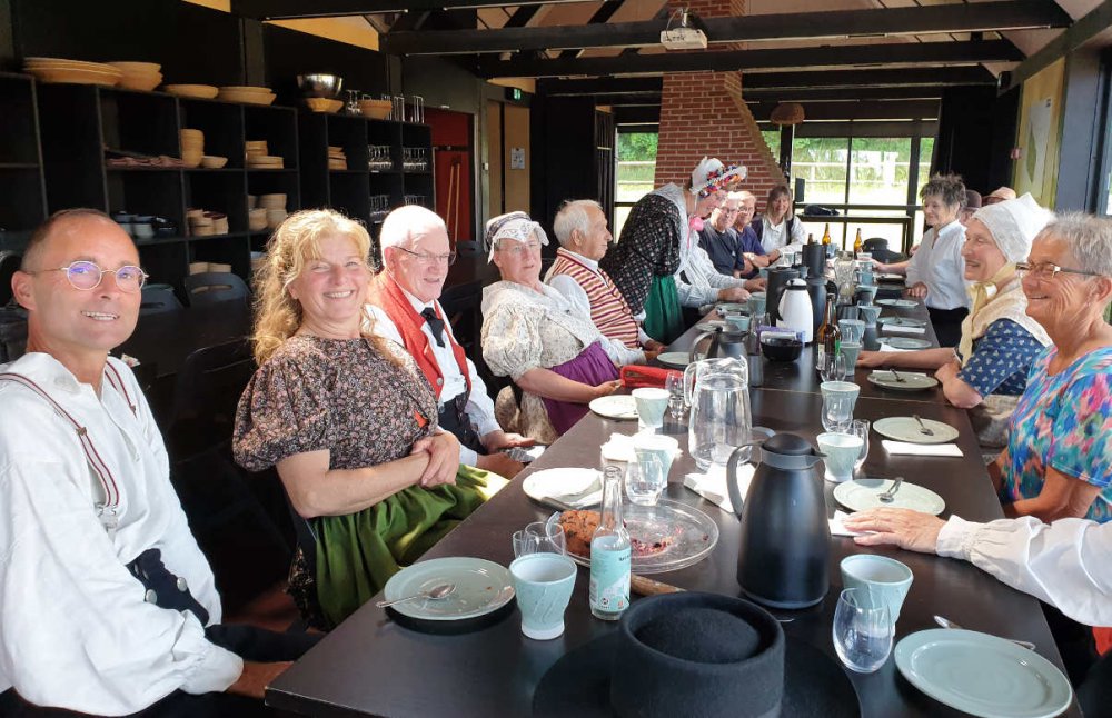 Så var vi på Melstedgård igen. Vejret var meget omskifteligt - skygge, sol, blæst af og til, og lidt regn på et tidspunkt. Instrumenter blev pakket væk i en fart, og kvinderne med stivelse i hovedtøjet flygtede under et tag. Efter ca. 5 minutter var regnen overstået og vi fortsatte.