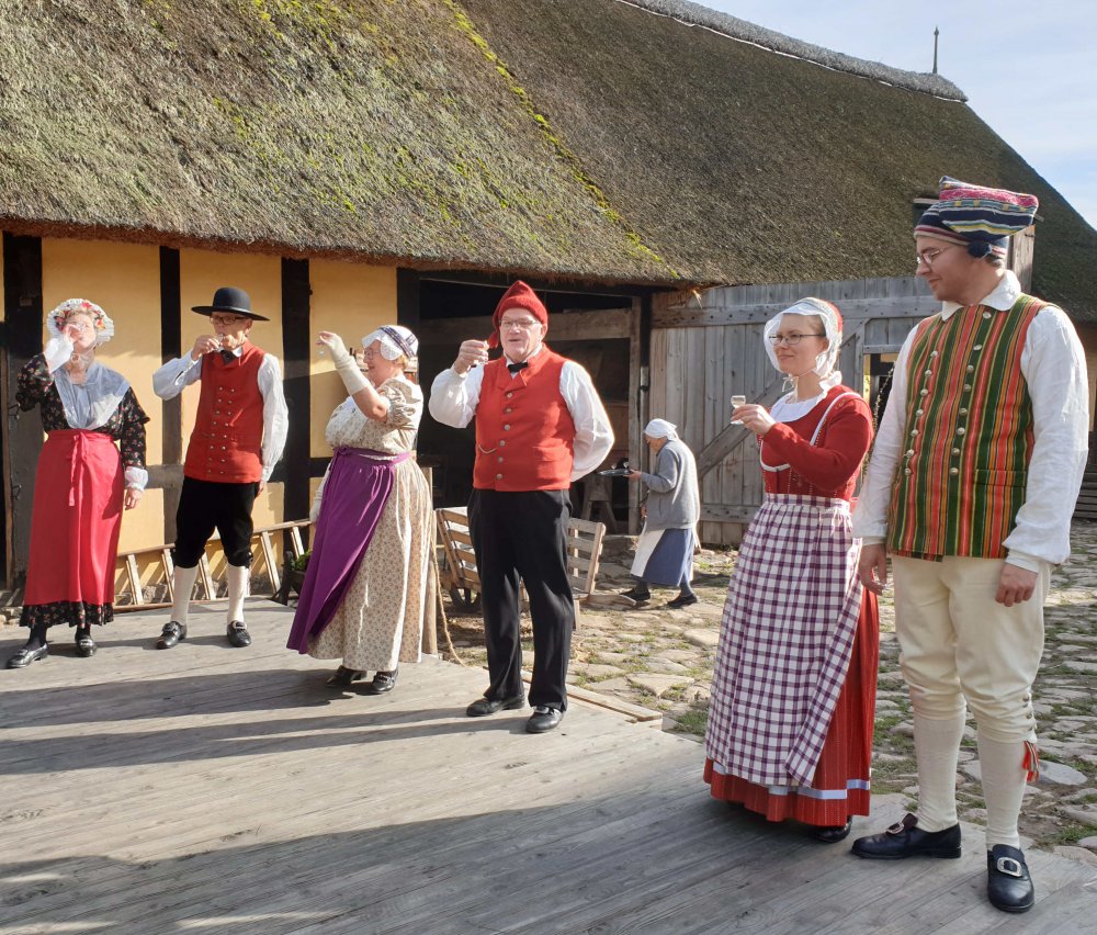 Når opvisningen er færdig får danserne og musikerne lov at spise kage og drikke syp og kaffe i laden. (Med dyrene.)