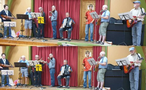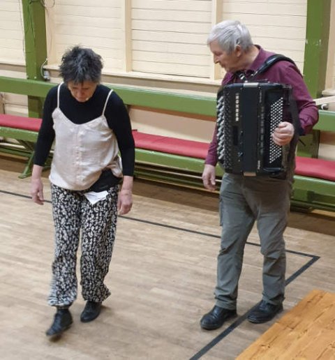 ![]() Der gennemgås dansetrin (før det hele starter). | ![]() Nogle af dem der spillede til dans. De er gemt godt af vejen, på [...]scenen, så de ikke bliver danset ind i. Læs mere...↑ | ![]() Et af de 2 hold står og venter på at få instruktioner. |