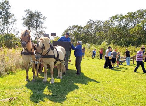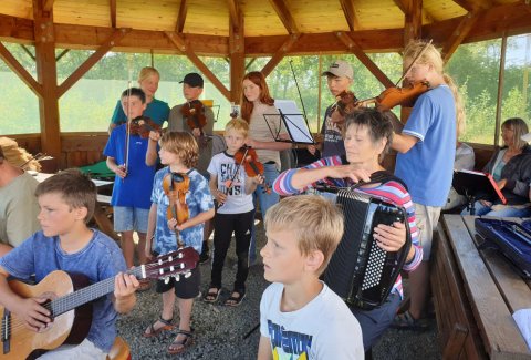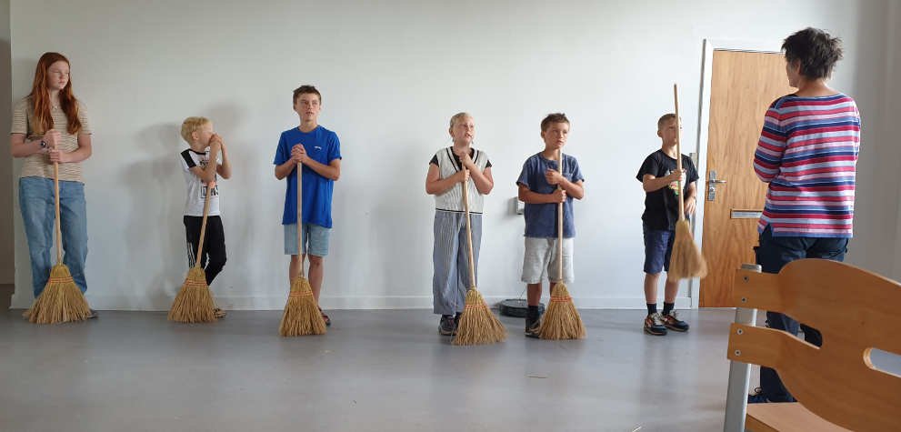 ![]() Børnene står klar til at lave kostestomp, en rytmisk øvelse. | ![]() Efter sommerskolen samledes børnene i legepladsen på Bornholmerkirken, hvor de også fik kage [...]og drikkevarer, og så fik de en tur i denne karet til Vestermaries Folkeskov, hvor de skulle optræde. Læs mere...↑ | ![]() Alle står klar til at spille et nummer. |