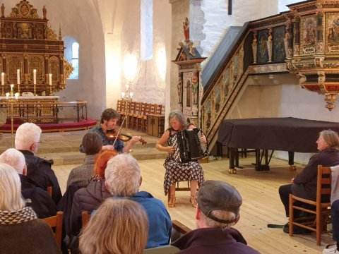 ![]() Kristian Bugge og Mette Jensen spiller her i Aakirke nogen livlige og flotte musik. |