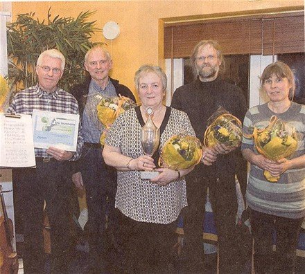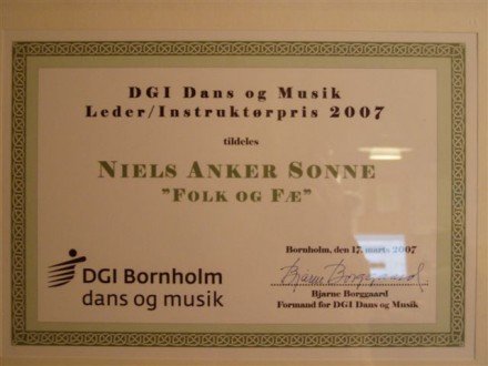 Bornholms Tidende: TAK FOR MUSIKKEN: DGI Bornholm har mange strenge at spille på - [...]og det blev i bogstaveligste forstand understreget, da spillemændene fra Folk & Fæ modtog Nyvests 125 års jubilæumspokal for deres medvirken til igangsættende aktiviteter i DGI Bornholm. Gruppen tæller omkring 20 medlemmer, der spiller sammen for musikkens skyld, men også stiller op for f.eks. øens folkedansere i større eller mindre grupperinger. I de sidste mange år har Folk & Fæ også stået for den musikalske ledsagelse til de sange, der synges undervejs, når DGI Bornholm holder generalforsamling. Så Henry Bech, Erling Jensen, Kirsen Schiølardt, Ole Nielsen og Dorthe Jønsson var lige i nærheden, da pokalen blev overrakt af Erik A. Larsen. Foto: Allan Rieck